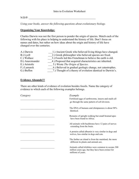 Intro To Evolution Worksheet. Web intro to evolution worksheet n/d/p: _____ using your books, answer the following questions about evolutionary biology.