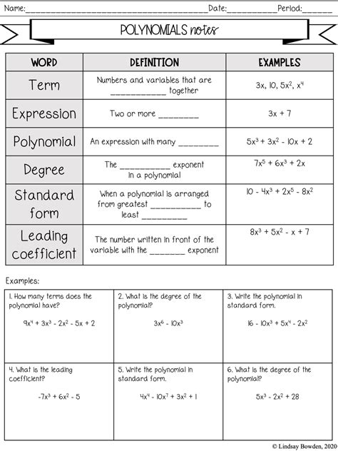 Web these polynomial guided notes and worksheets cover: 1) −10 x linear monomial 2) −10 r4 − 8r2 quartic binomial 3) 7. Degree and coefficient of polynomials.